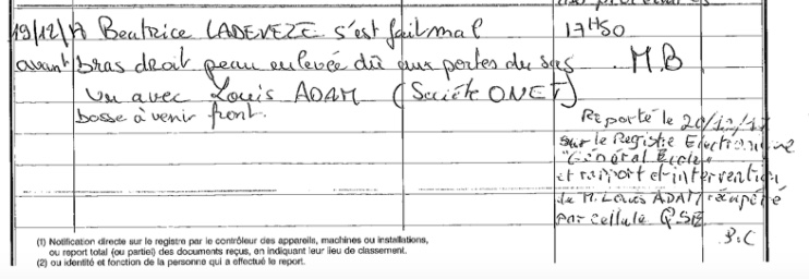 En pièce jointe, le scanne de l'accident relevé du registre H&S de l'accueil. (cliquer sur le ligne ci dessous)